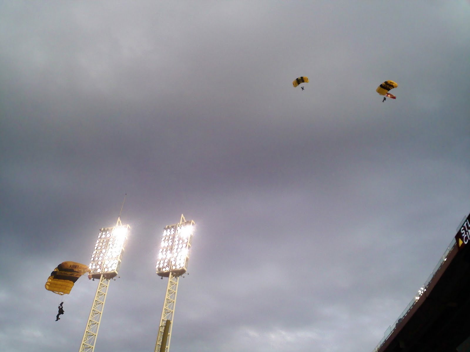 Army parachuters delivering the game ball to the field